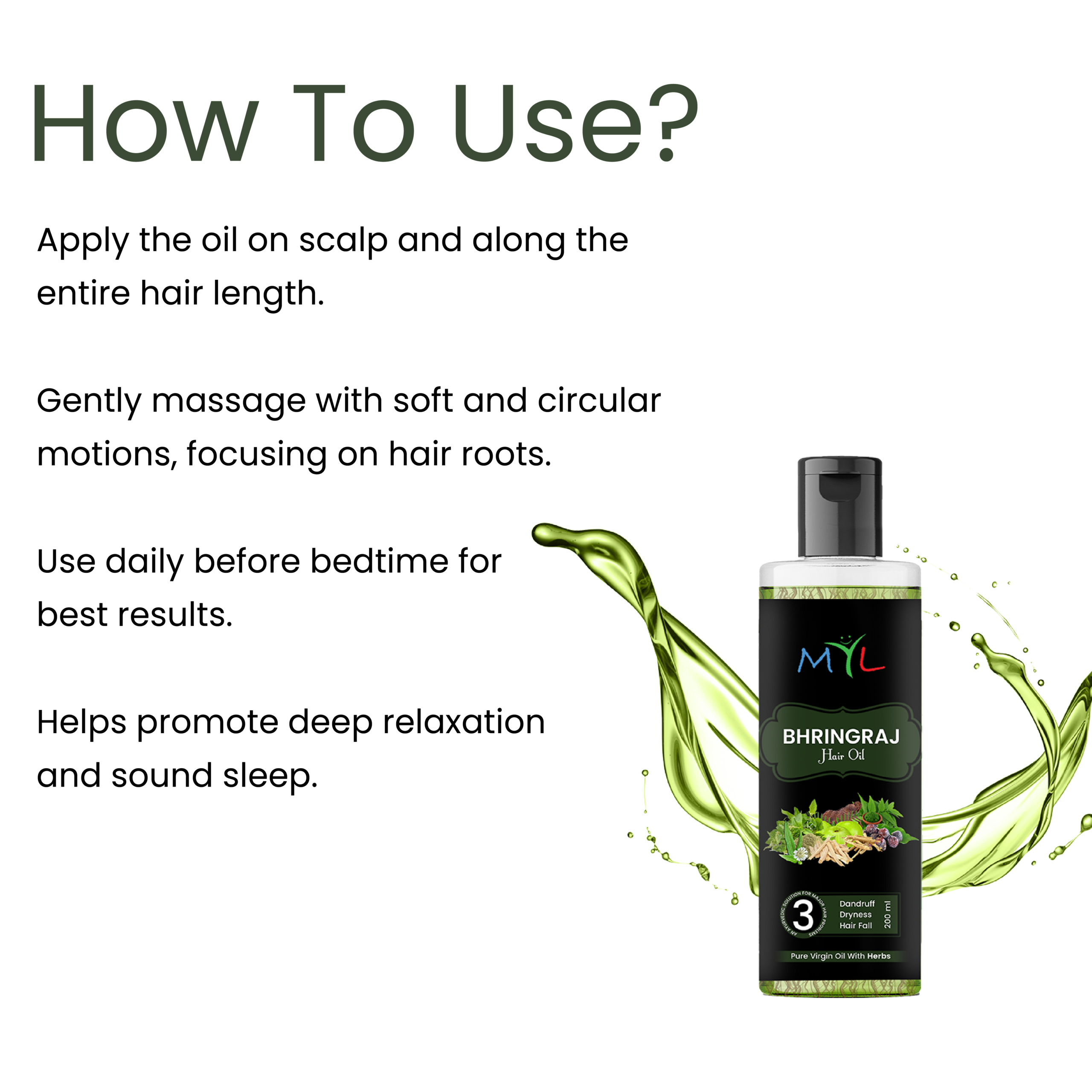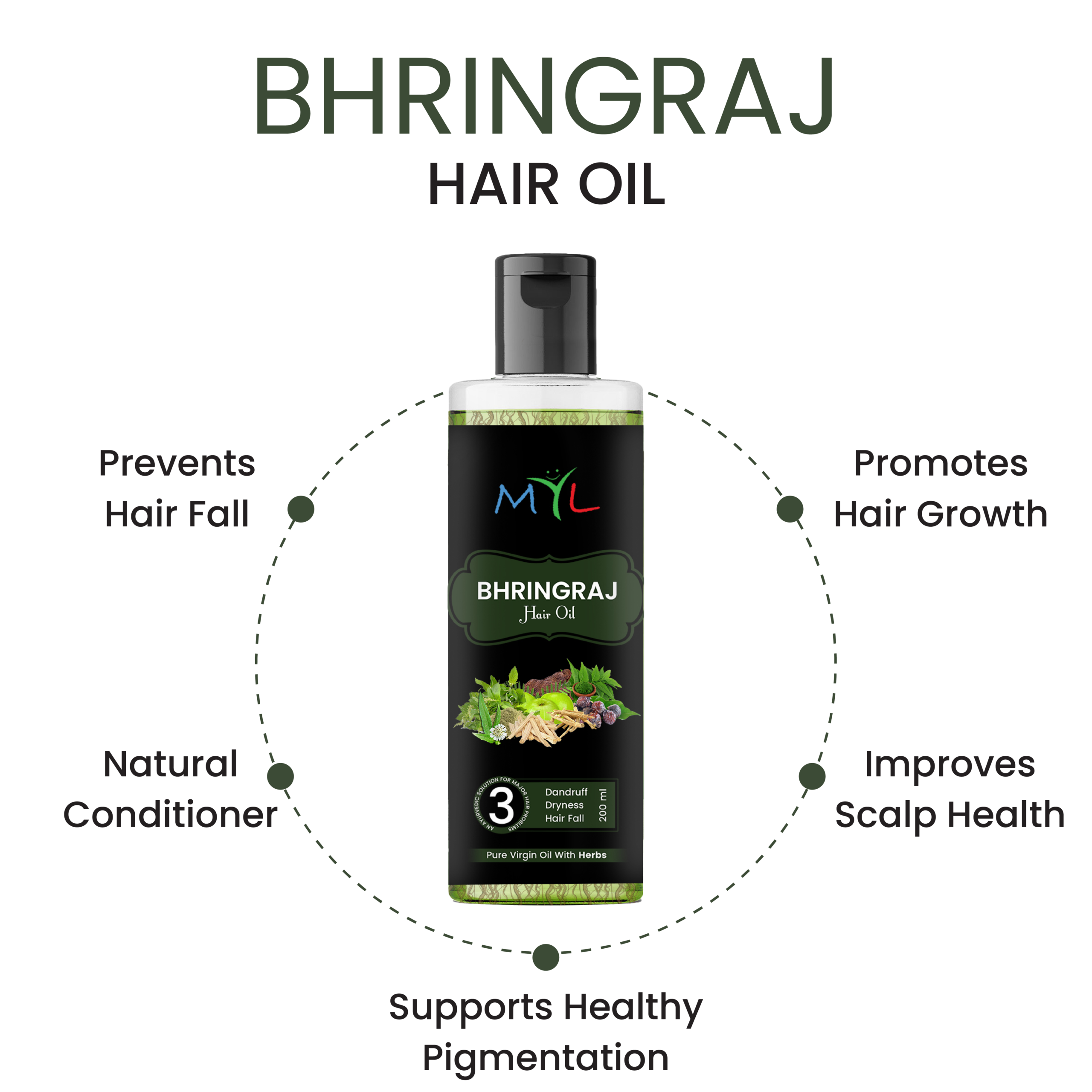MYL AYURVEDIC HAIR OIL IS AN ALL ROUNDER HAIR TONIC , THIS AYURVEDIC & HERBAL HAIR OIL WITH HERBS REVITALIZES THE HAIR FOLLICLE AND PROMOTES NATURAL HAIR GROWTH WITH IMPROVED BLOOD CIRCULATION IN THE SCALP.