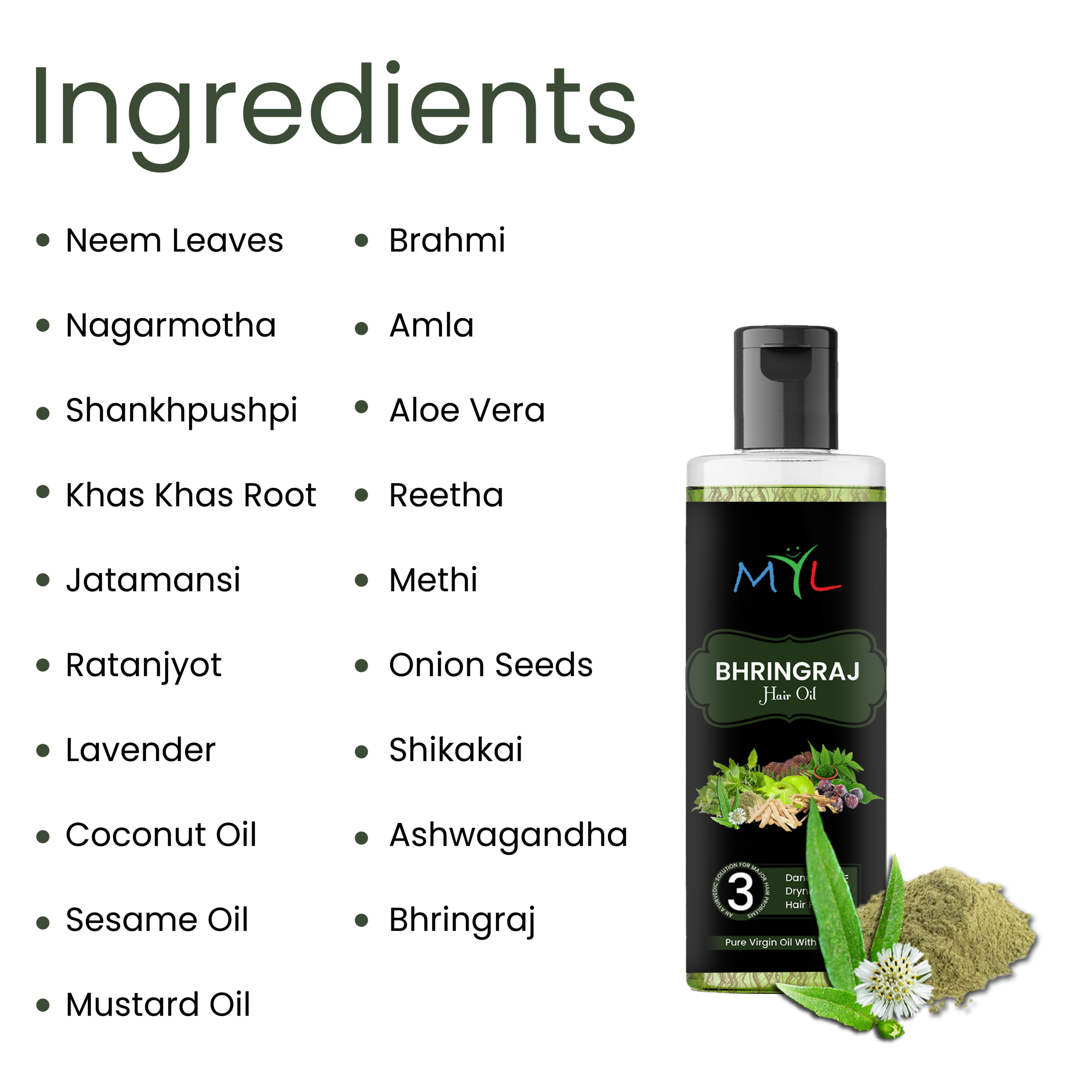 BRAHMI, AMLA, ALOE VERA, REETHA, METHI, ONION SEEDS , SHIKAKAI, ASHWAGANDHA, BHRINGRAJ, NEEM LEAVES, NAGARMOTHA, SHANKHPUSHPI, KHAS KHAS ROOT, JATAMANSHI, RATANJYOT, LAVENDER, COCONUT OIL, SESAME OIL & MUSTARD OIL
